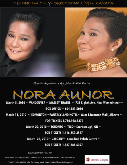 Watch Nora Aunor live in concert in Calgary on Friday, March 26, 2010 at the Polish Canadian Cultural Centre. With a special appearance by John Robert Porter and Front act performances by Joanne Tamayo and Mary Kate Aquino